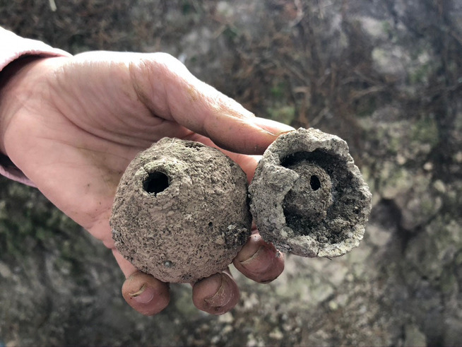 Figura 3. Bolas nido de escarabajos secas, encontradas en un talud de tierra de más de cincuenta años. Crédito de la fotografía:Ricardo Morales.